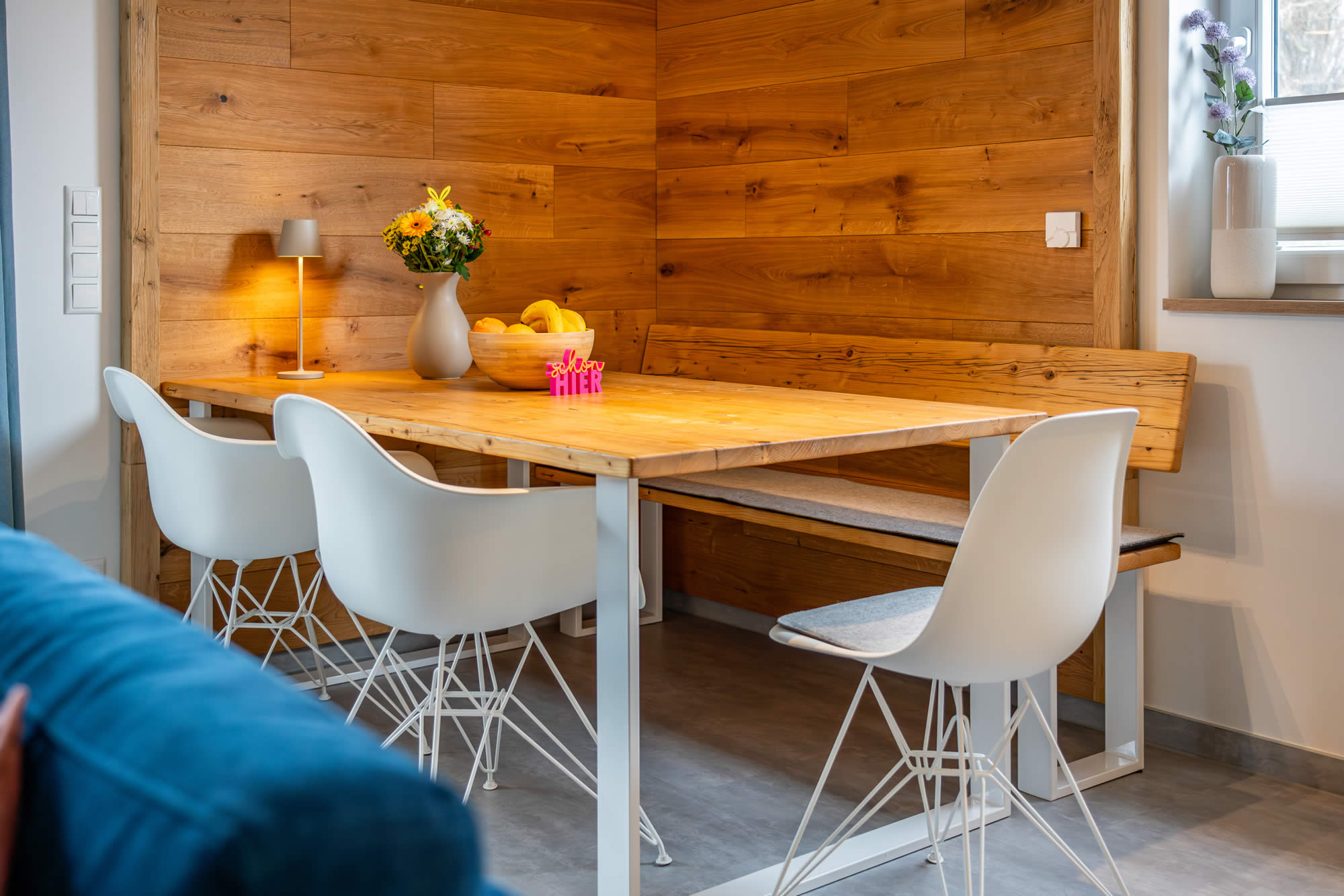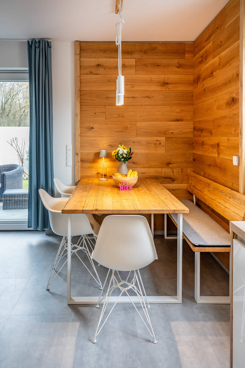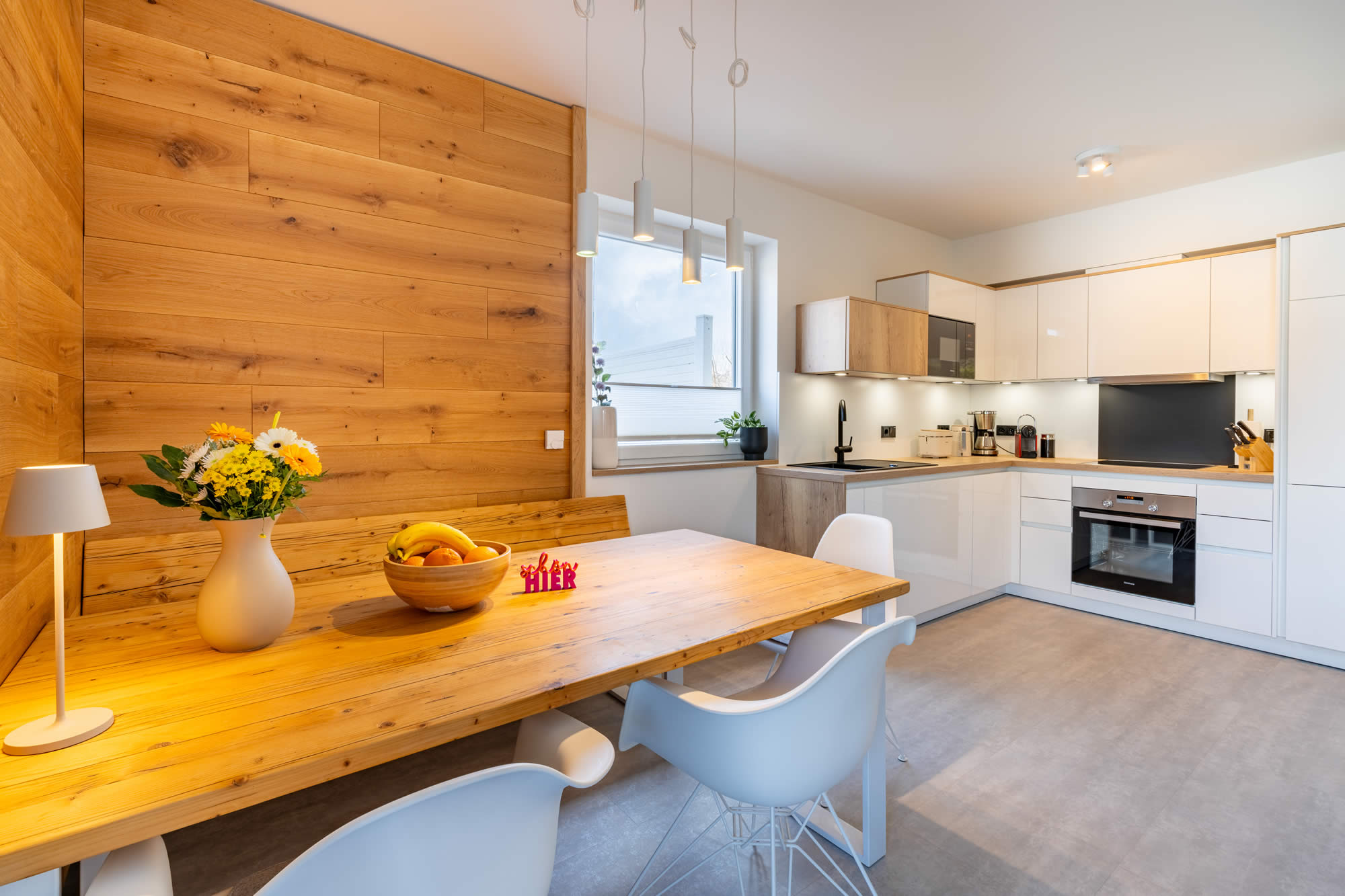 Die offene, moderne und voll ausgestattete Küche sowie der große Esstisch bieten ideale Bedingungen für gemeinsame Abende.