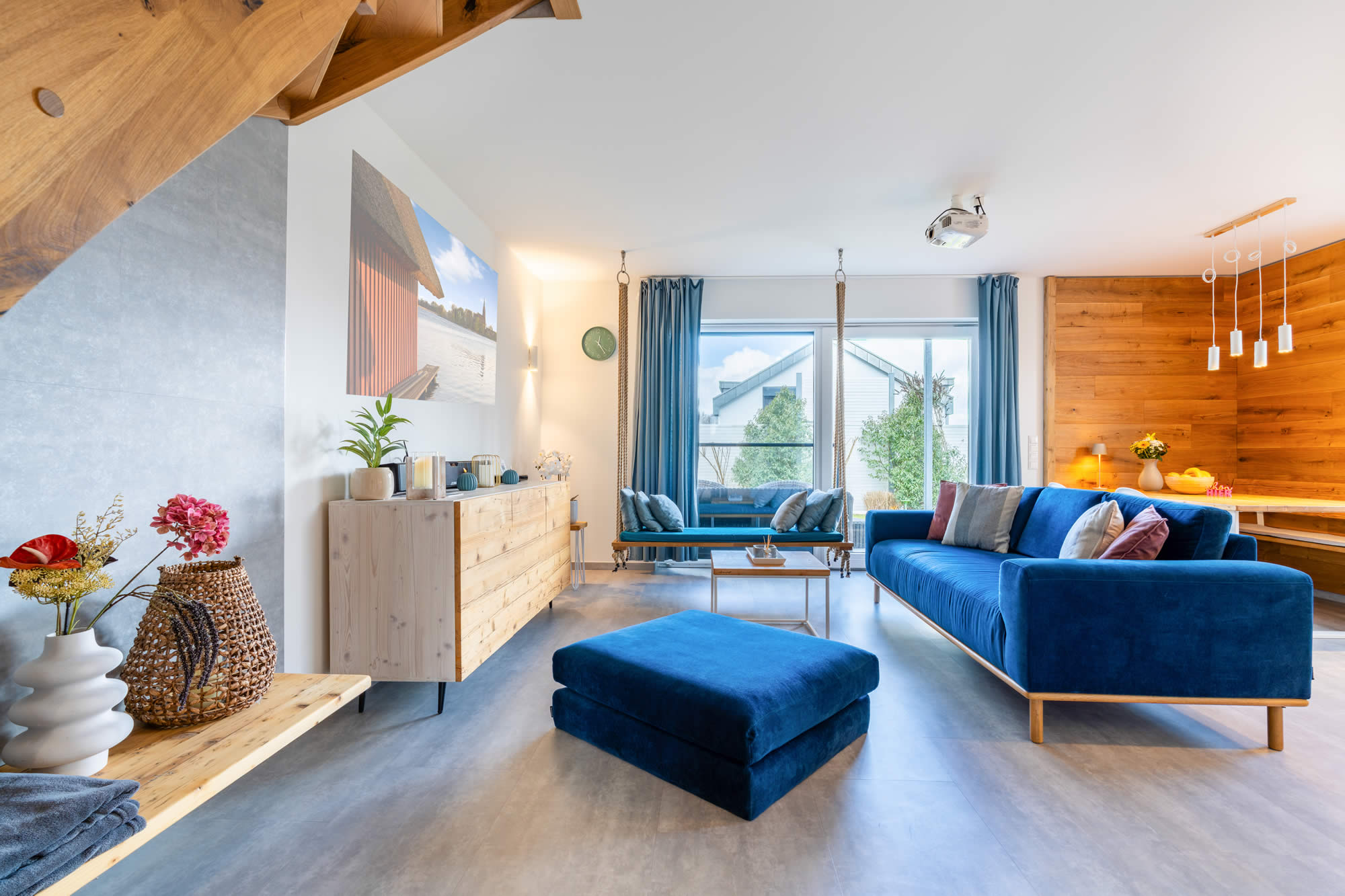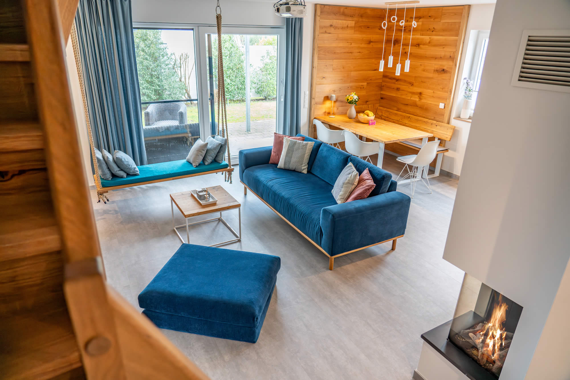 Der große Wohn-/Essbereich ist das Herzstück des Hauses. Die loungeartige Sofaecke mit Indoor-Schaukel, ein Beamer mit Sky und ein moderner Glaskamin laden zum Entspannen ein.
