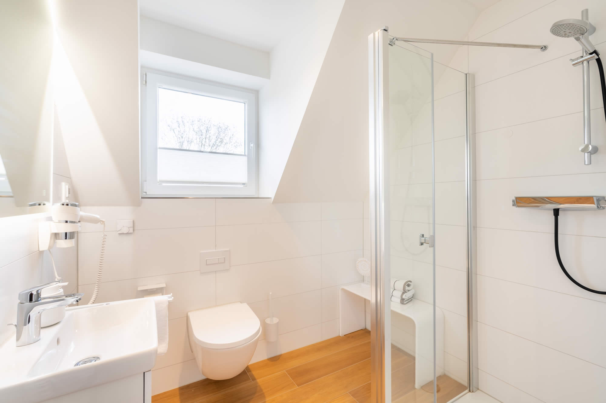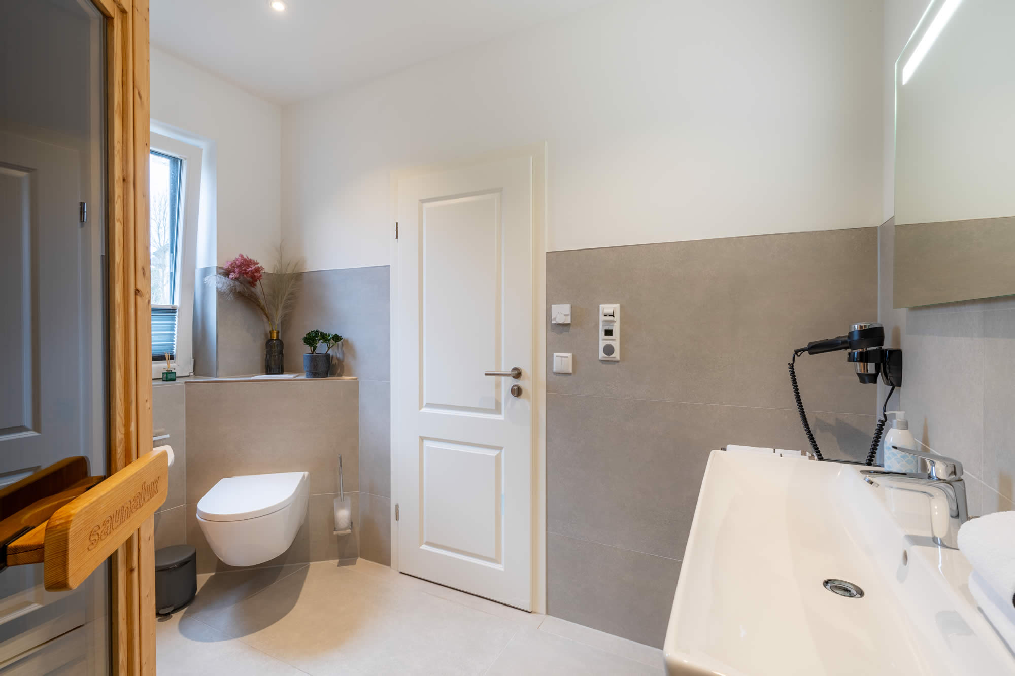 Im Erdgeschoss finden Sie ein großzügiges Badezimmer mit Dusche und eine Wohlfühlsauna.