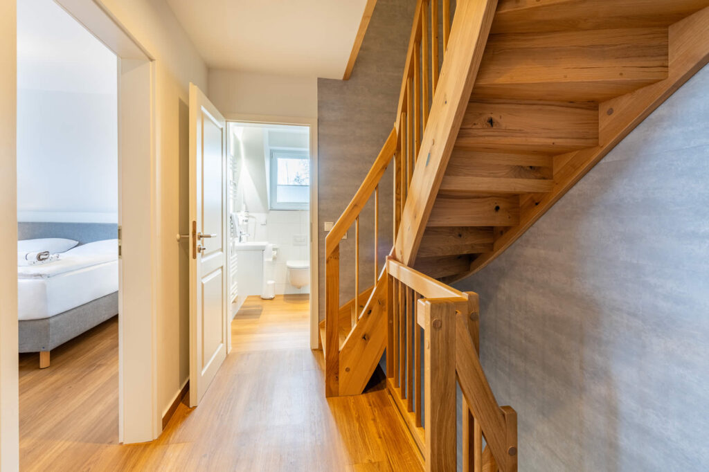 Im Obergeschoss befinden sich zwei große Schlafzimmer mit Hotelboxspringbetten. Das Elternzimmer verfügt über einen Balkon mit Blick auf den Schlosspark, perfekt für atemberaubende Sonnenuntergänge.